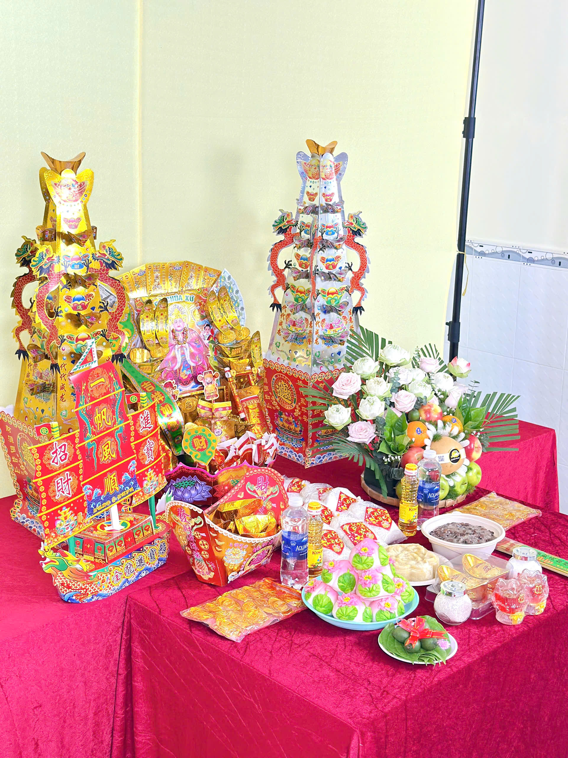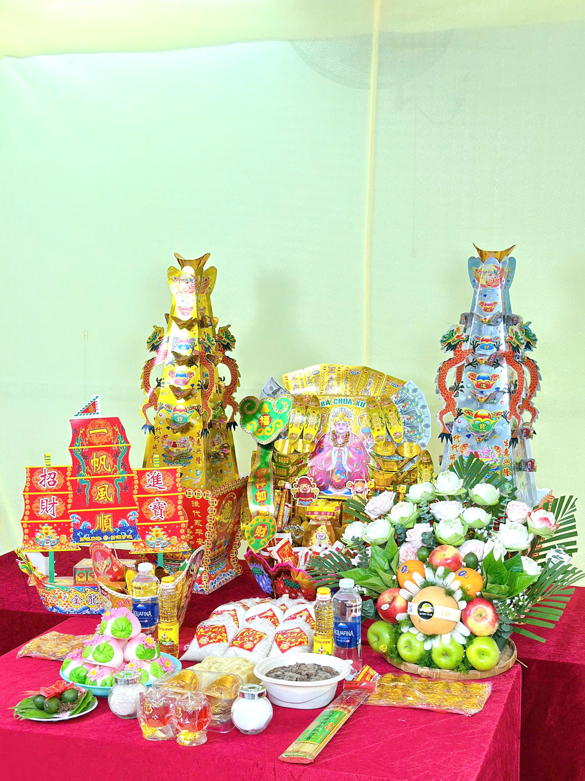 Chi tiết: Gồm Mẹt trái cây hoa sen trắng, Bánh bao trái đào, Xôi Chè, Trầu cau, Muối gạo, Dầu ăn, Nước, Thỏi vàng, Nhang đèn, Áo Bà giấy, Giấy tiền, Tiền vàng, Giấy cúng, Tháp vàng tháp bạc, Thuyền thuận buồm xuôi gió, Thuyền vàng.
