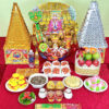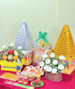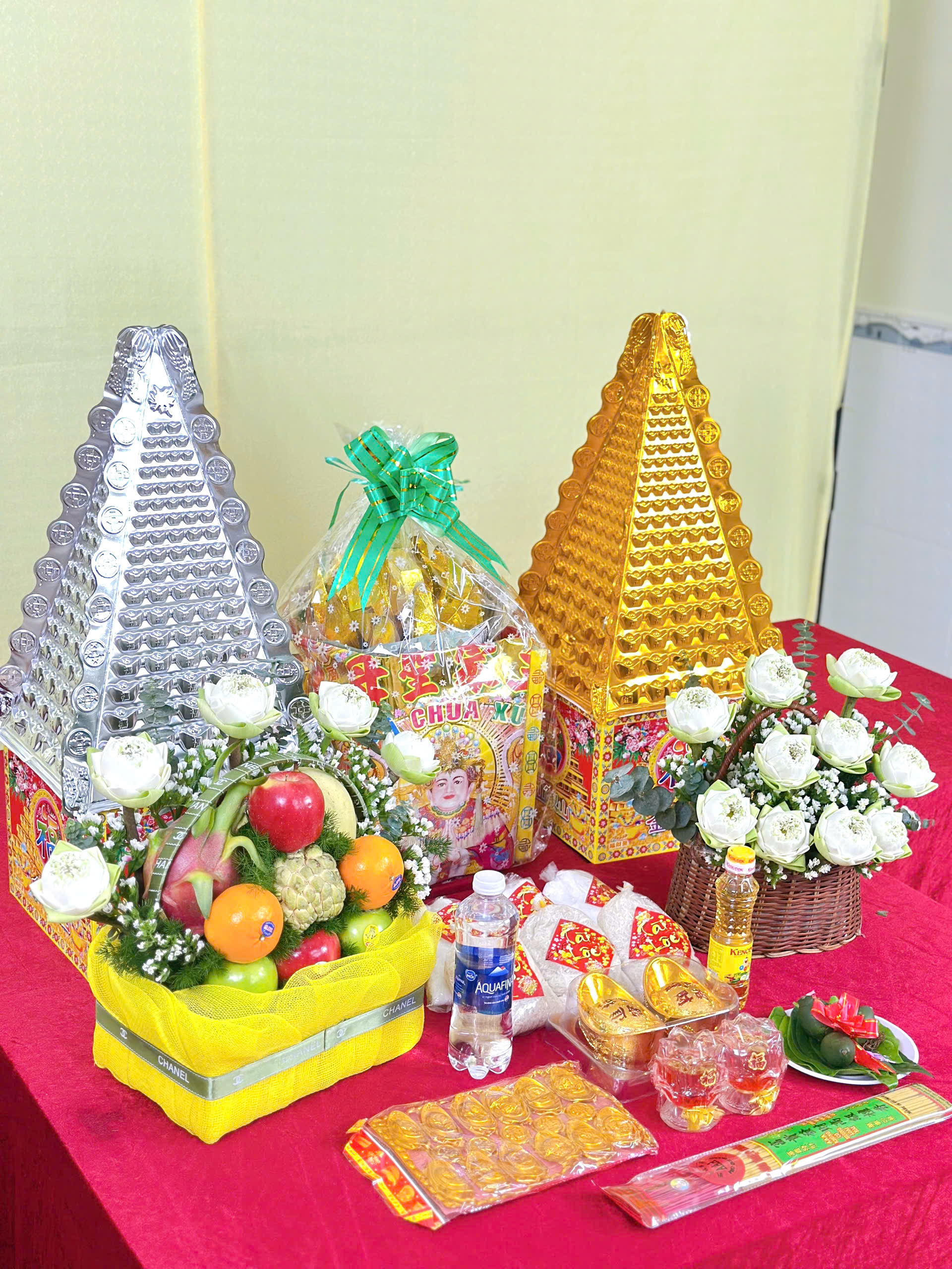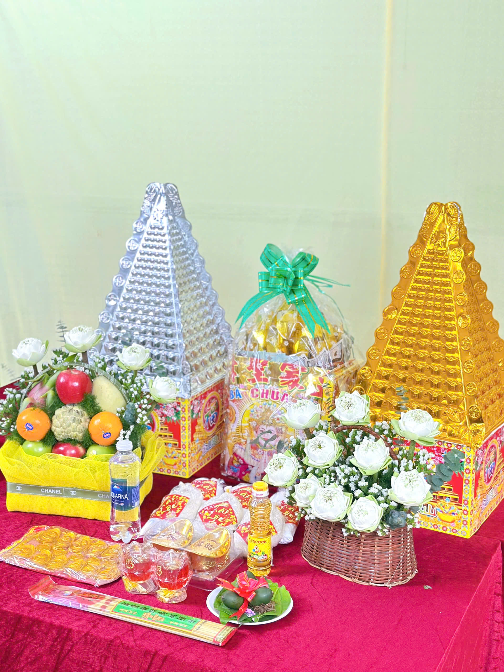 Chi tiết: Gồm Giỏ trái cây truyền thống và giỏ hoa sen trắng, Trầu cau, Muối gạo, Dầu ăn, Nước, Thỏi vàng, Nhang đèn, Áo Bà giấy, Giấy tiền, Tiền vàng, Giấy cúng, Tháp vàng tháp bạc nhỏ