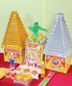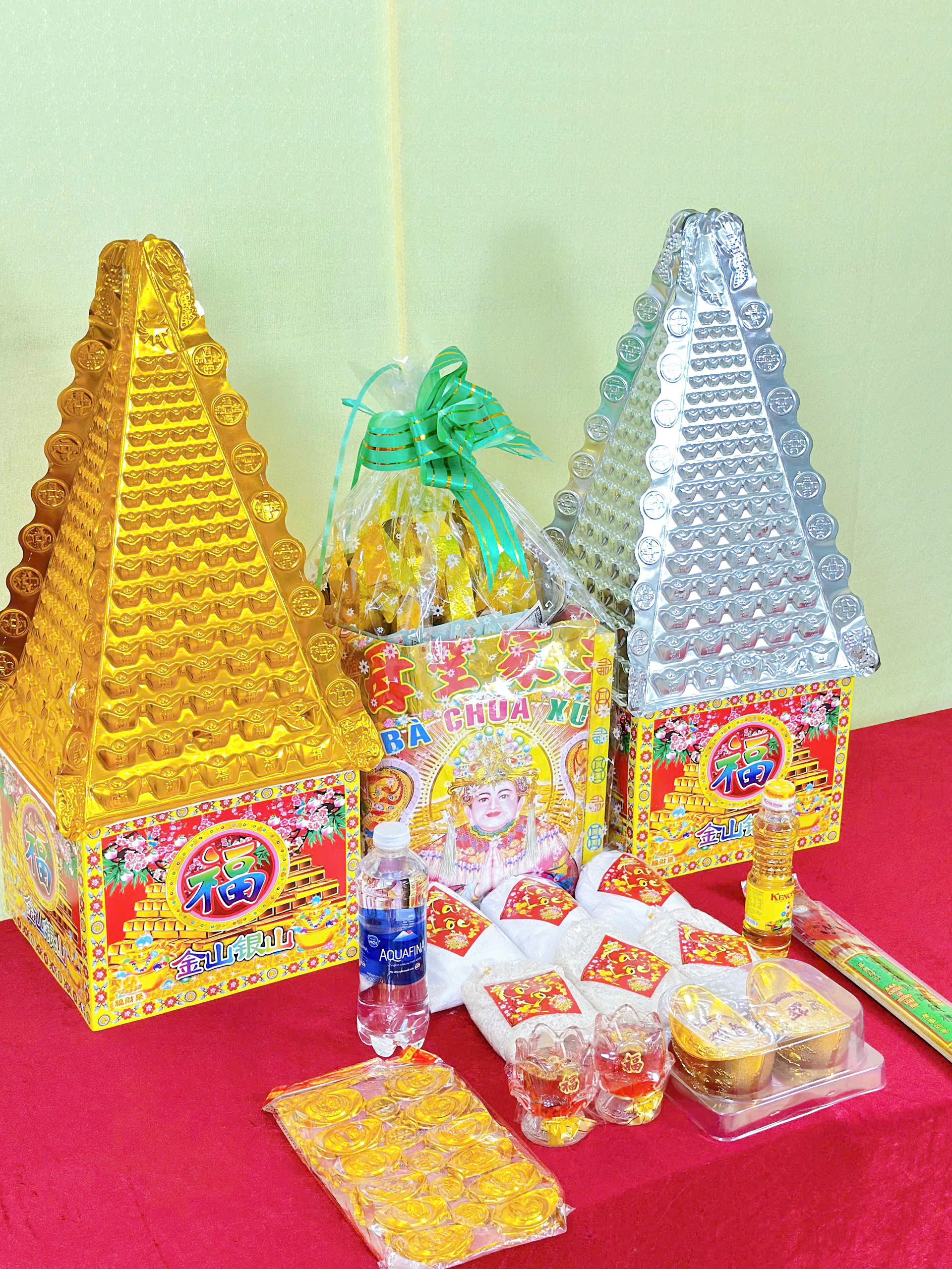 Chi tiết: Gồm Muối gạo, Dầu ăn, Nước, Thỏi vàng, Nhang đèn, Áo Bà giấy, Giấy tiền, Tiền vàng, Giấy cúng, Tháp vàng tháp bạc nhỏ.
