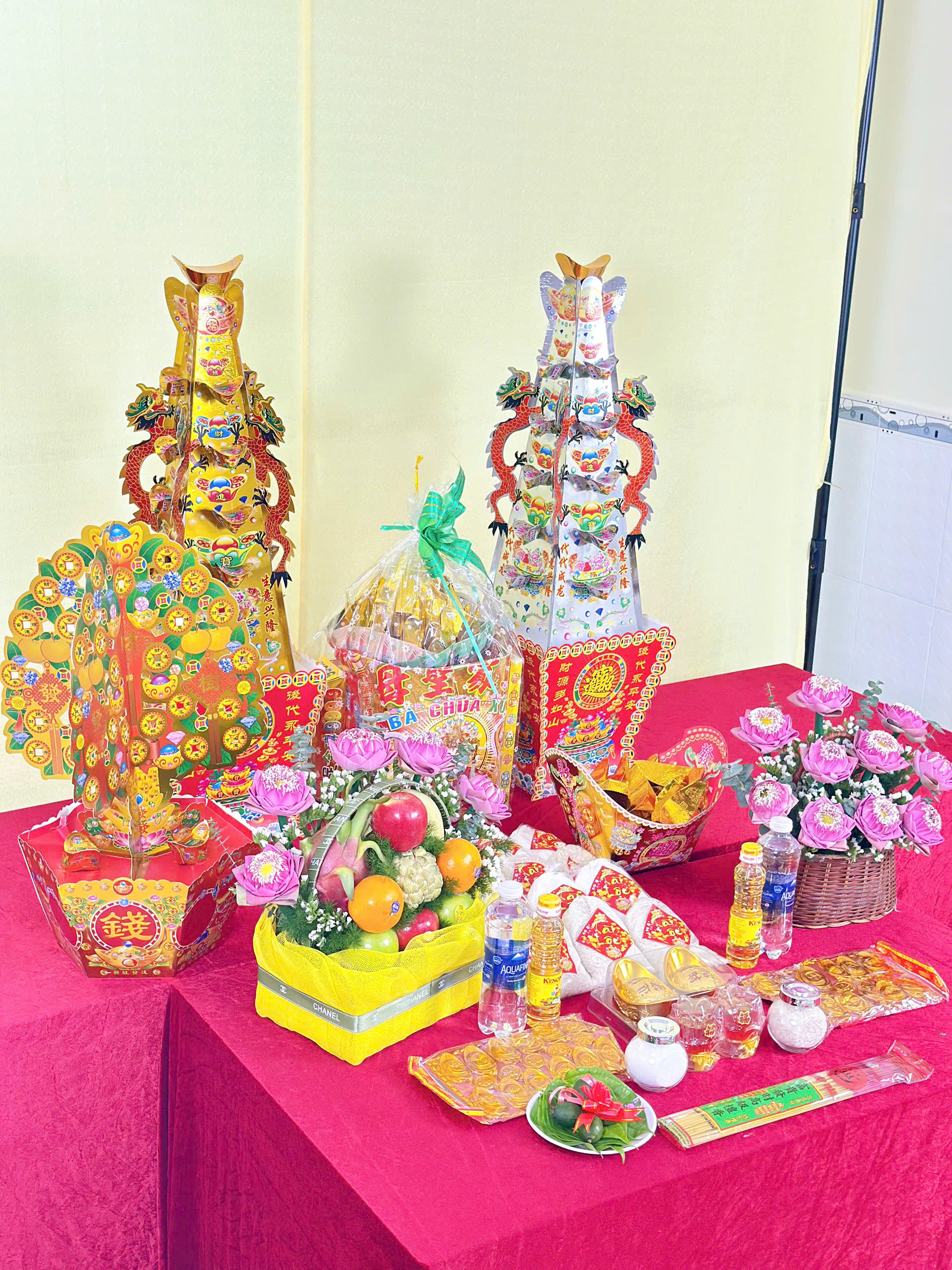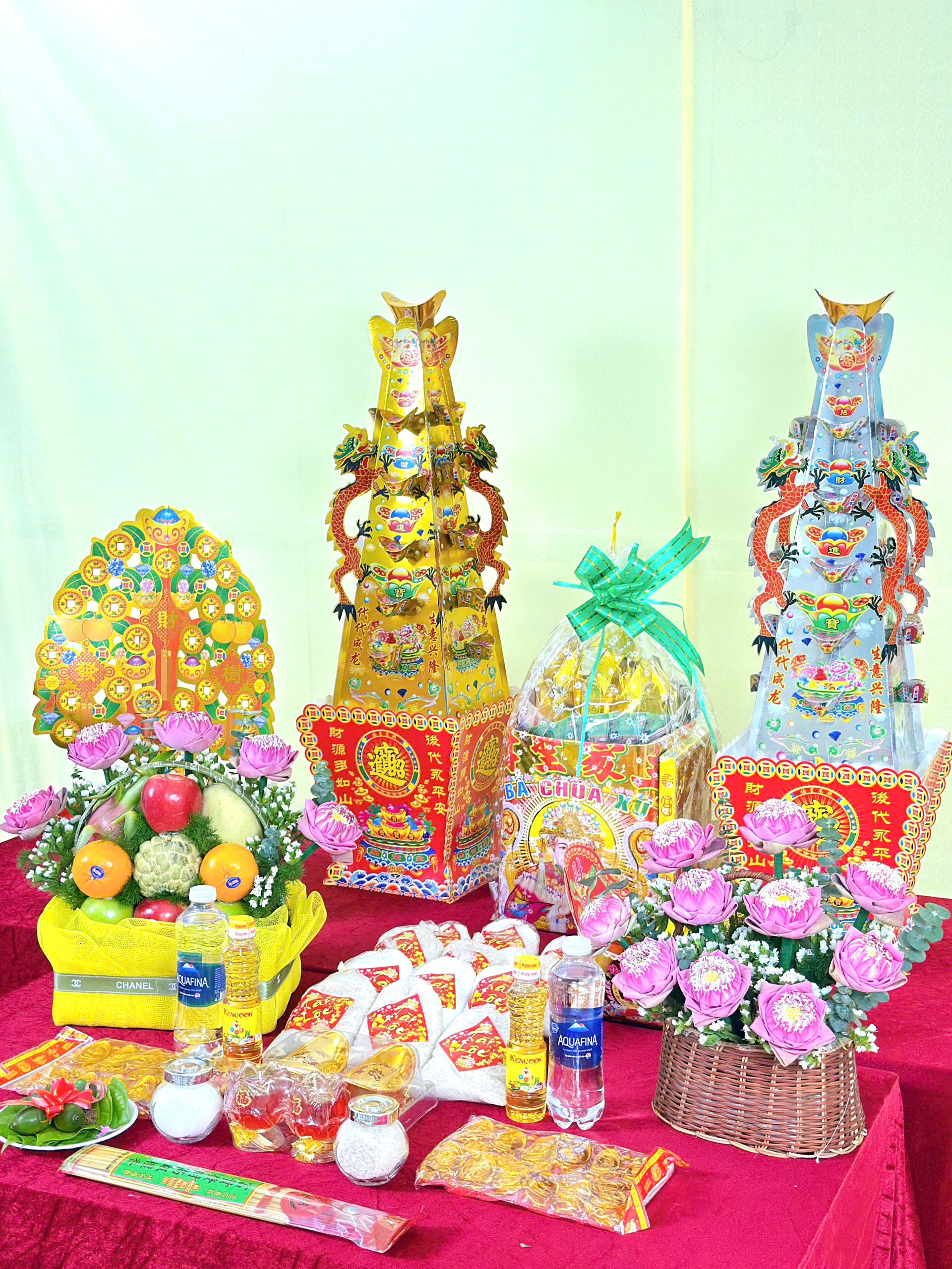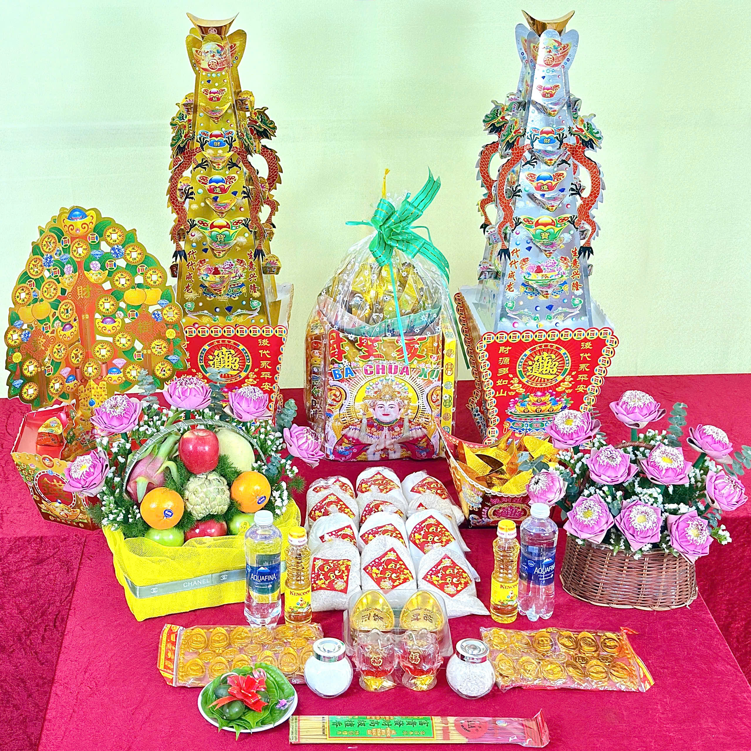 Chi tiết: Gồm Giỏ trái cây truyền thống hoa sen hồng, Trầu cau, Muối gạo, Dầu ăn, Nước, Thỏi vàng, Nhang đèn, Áo Bà giấy, Giấy tiền, Tiền vàng, Giấy cúng, Tháp vàng tháp bạc, Cây phát tài, Thuyền vàng.